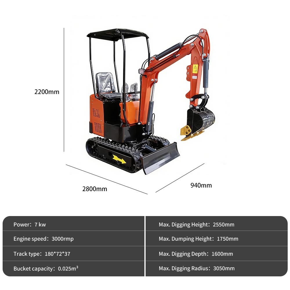 With a 0.025 m³ bucket capacity and maximum digging depth of 1600 mm, it delivers sufficient reach and power for various light-duty excavation jobs.